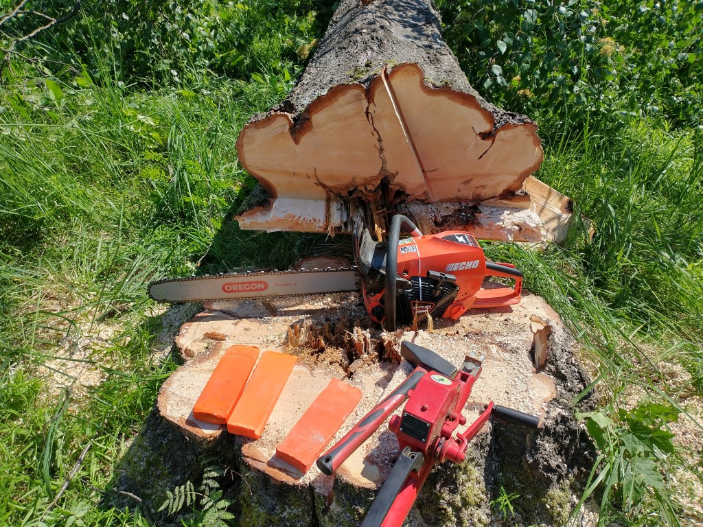 Närbild av fällningsutrustningen. Björken hade redan börjat ruttna.